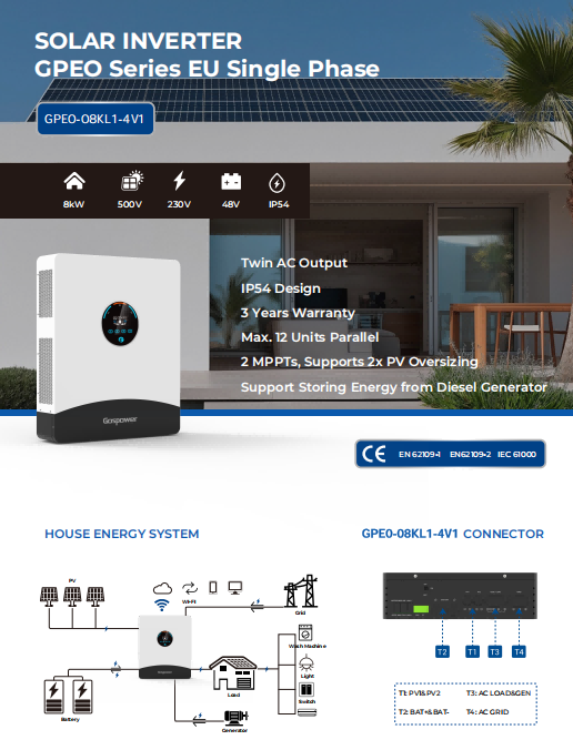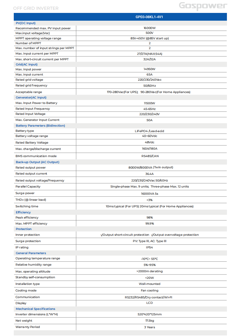 Gospower GPE0-08KL1-4V1 pure sine wave solar inverter is a perfect design for home- installation with its compact size and quick setting. With a wide MPPT operating range of 85-450V, Gospower inverter is a good option for your household system.