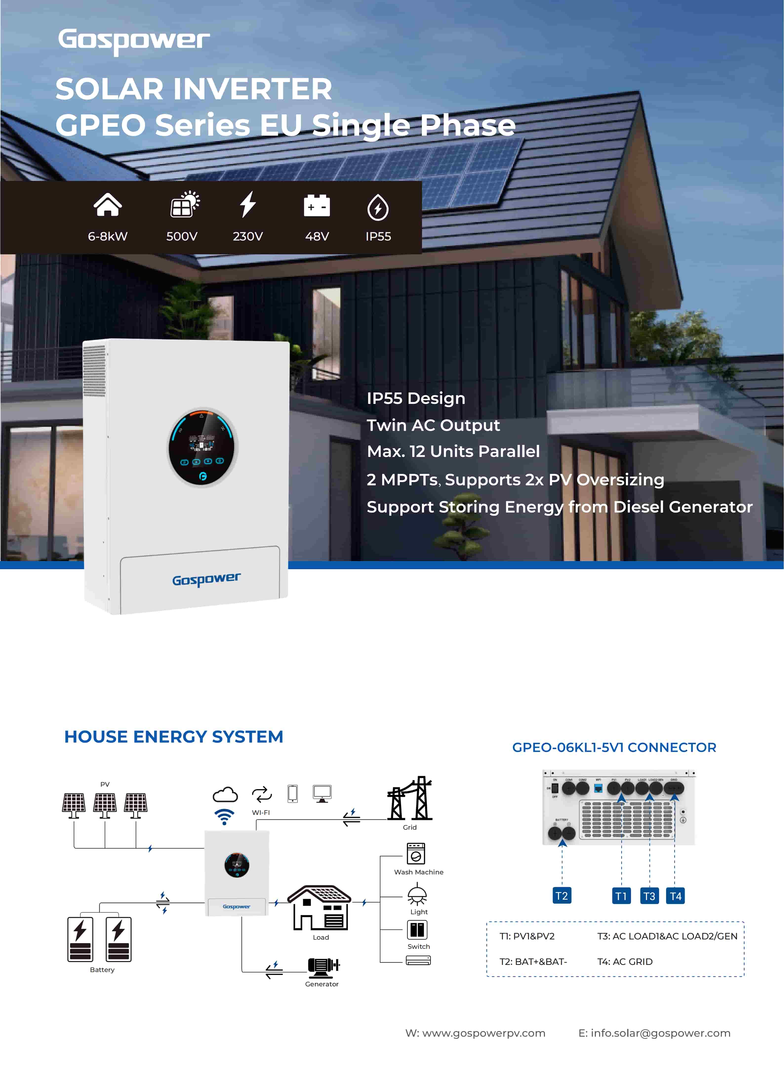 Gospower GPEO-6KL1-5V1 pure sine wave solar inverter is a perfect design for home- installation with its compact size and quick setting. With a wide MPPT operating range of 85-450V, Gospower inverter is a good option for your household system.